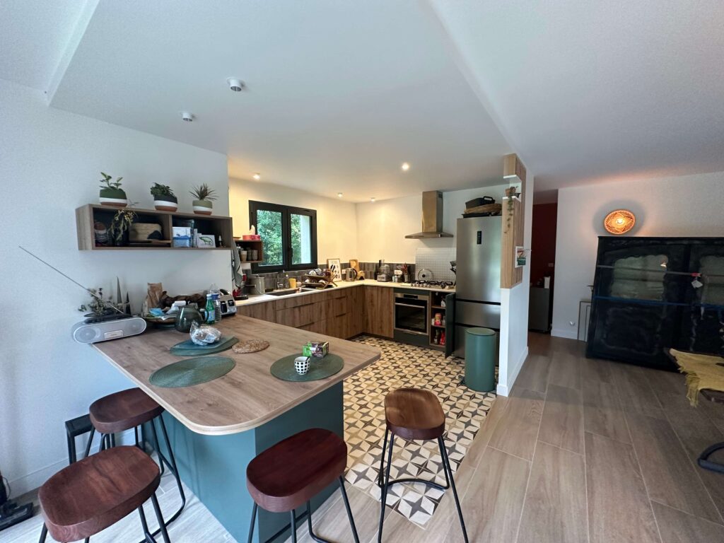 À l’intérieur, l’extension transforme l’expérience de l’espace de vie. De larges baies vitrées double hauteur ouvrent la maison sur le jardin, maximisant les apports de lumière naturelle et créant une relation fluide entre dedans et dehors.
