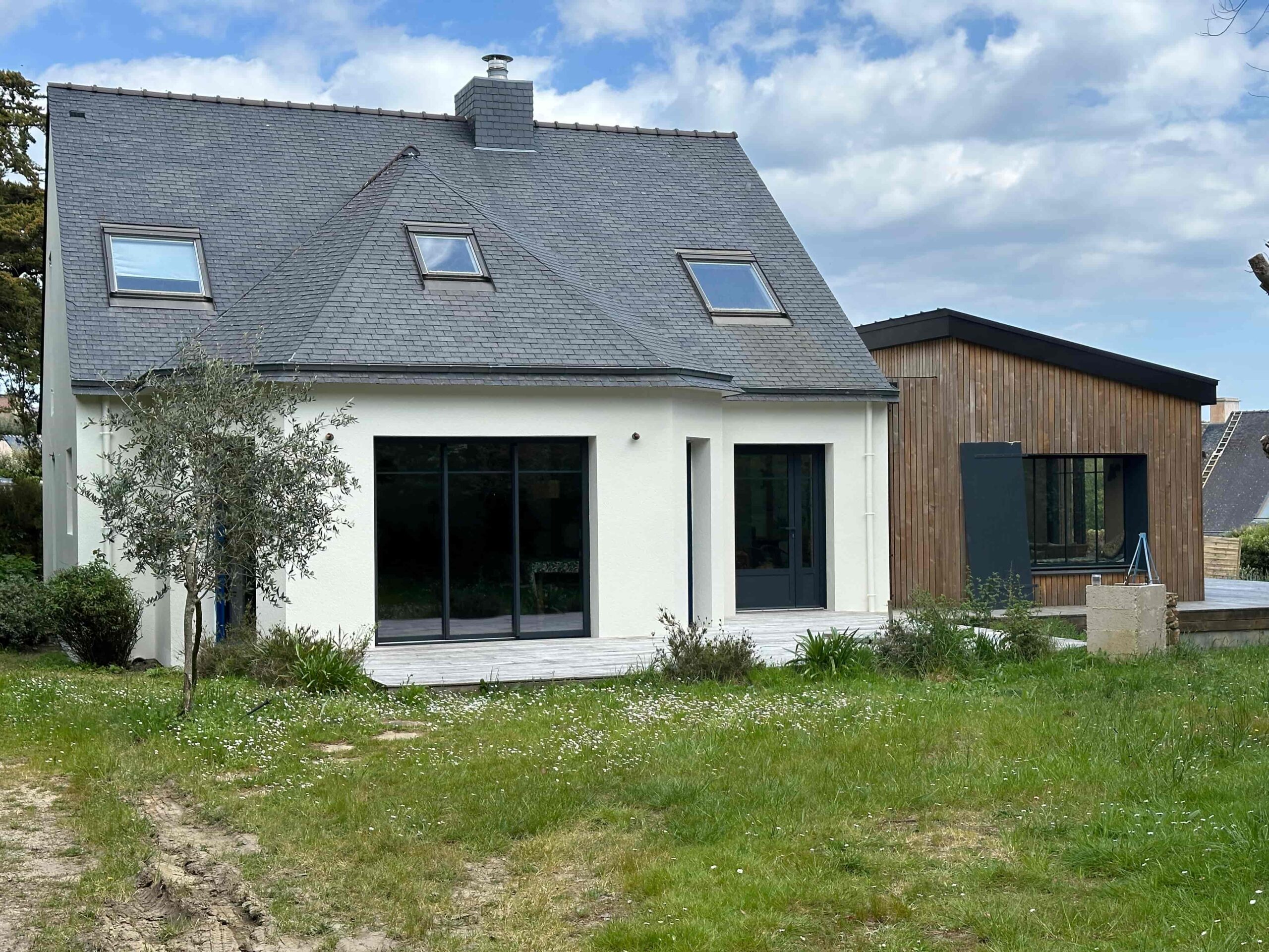 Sur la presqu’île de Rhuys, ce projet d’extension s’inscrit dans un environnement boisé et littoral, où l’architecture cherche l’équilibre entre intégration paysagère et modernité. Le nouveau volume en ossature bois vient prolonger la maison existante avec légèreté, en reprenant des matériaux et des teintes en harmonie avec le contexte naturel de Saint-Gildas-de-Rhuys.