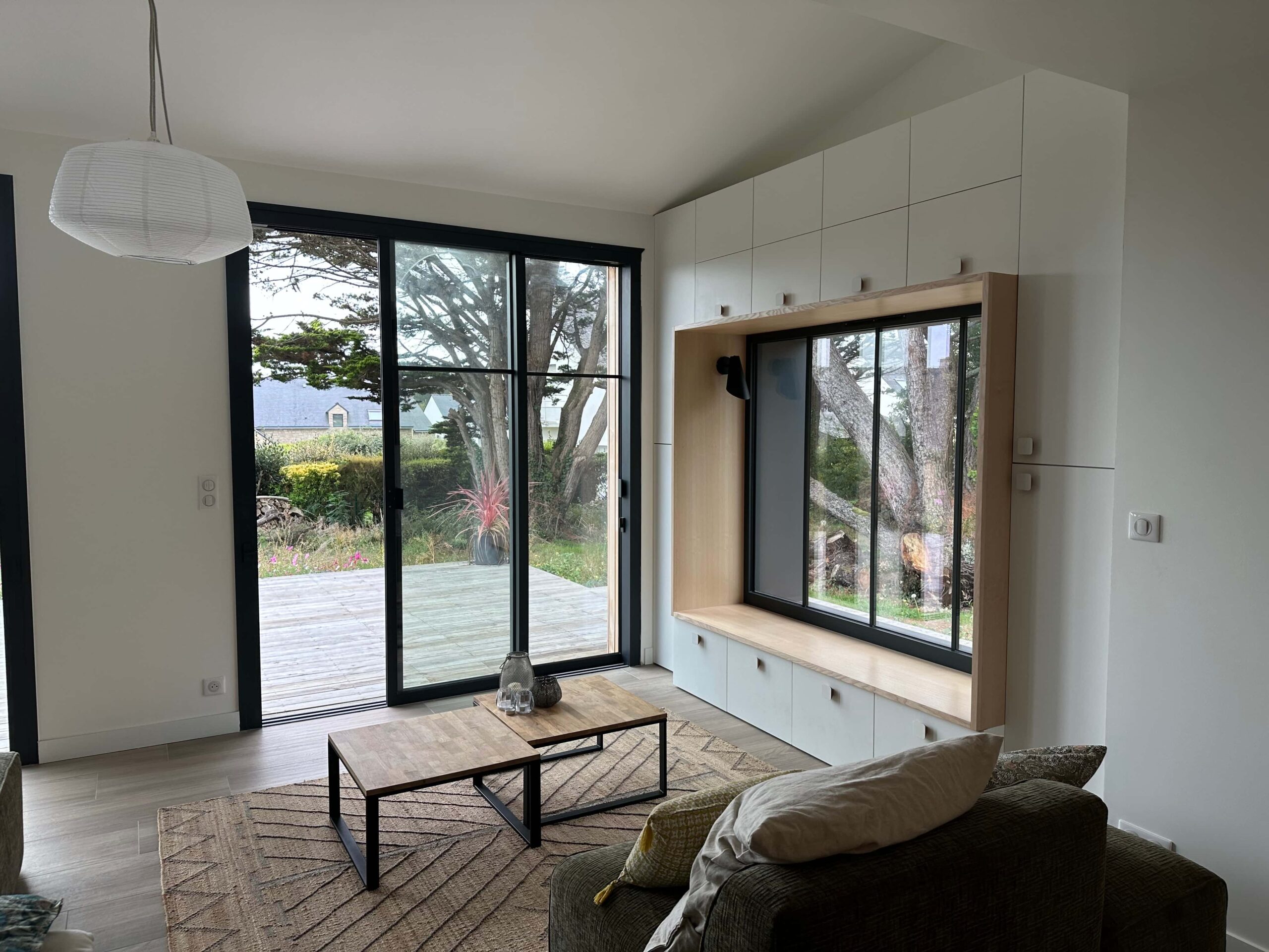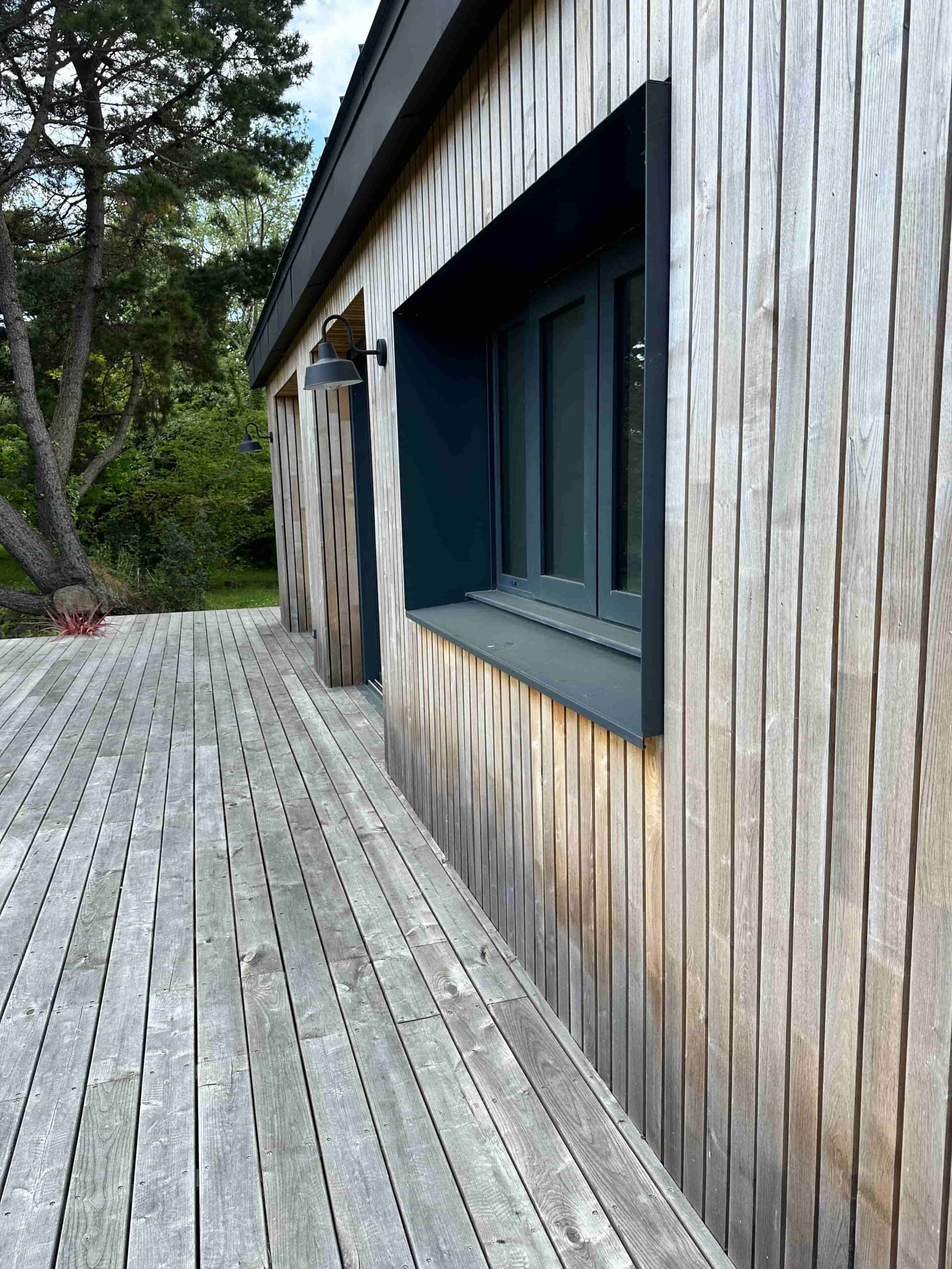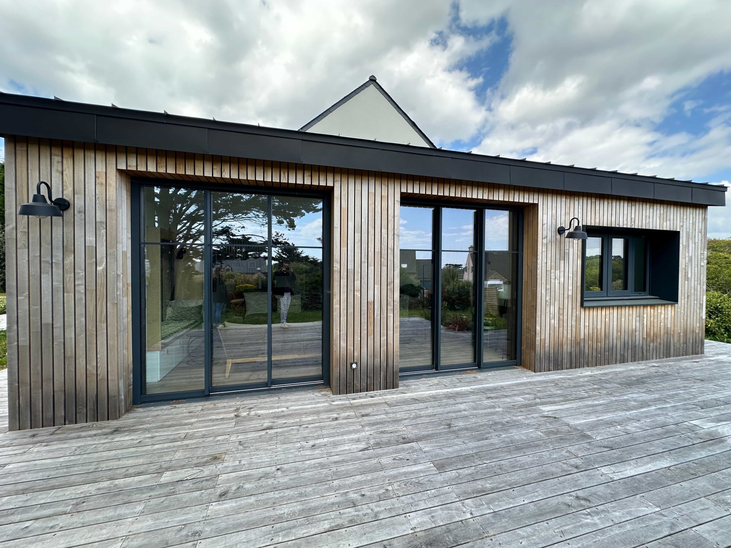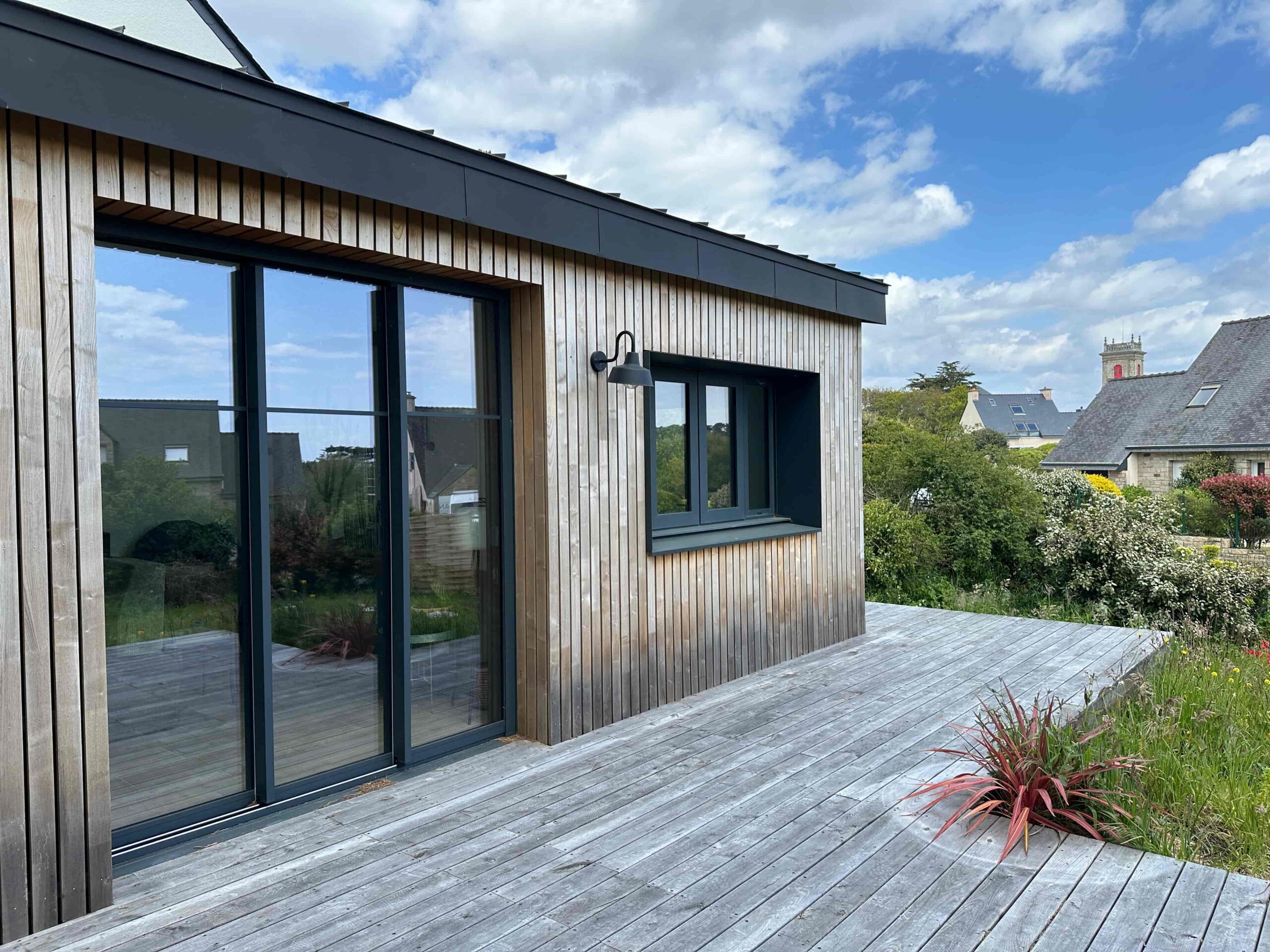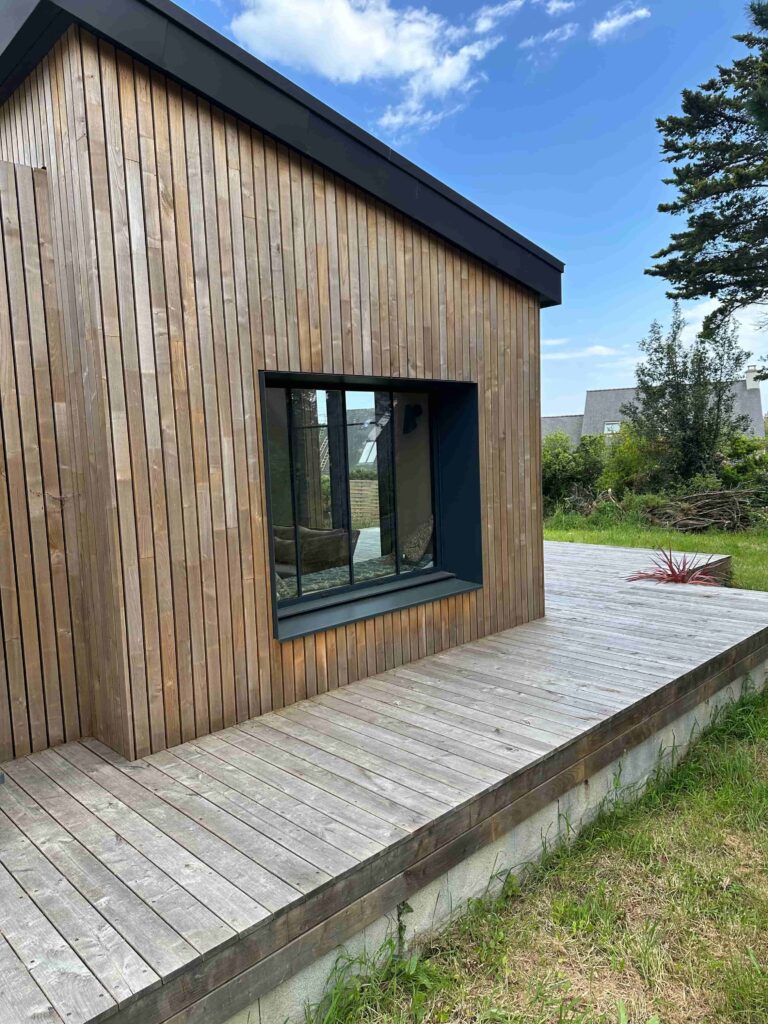 Enfin, le prolongement de la terrasse bois vient relier visuellement la maison au paysage, renforçant l’esprit balnéaire et contemporain du projet.