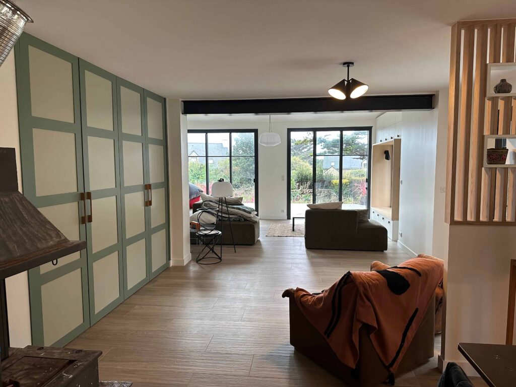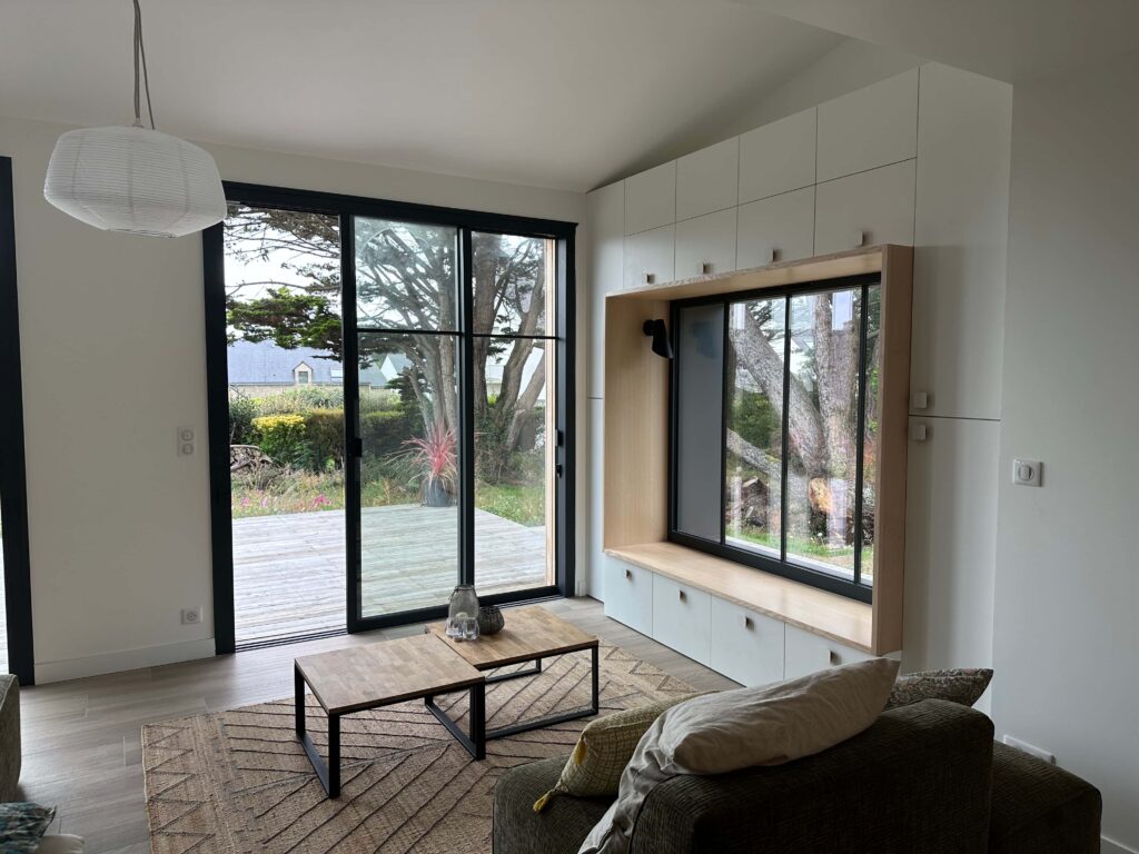 L’aménagement intérieur a été retravaillé pour optimiser les circulations et intégrer du mobilier sur mesure autour des ouvertures existantes, notamment un coin lecture chaleureux et fonctionnel. La continuité entre l’ancien et le nouveau se traduit par des matériaux chaleureux, des volumes généreux et une attention portée aux détails architecturaux.