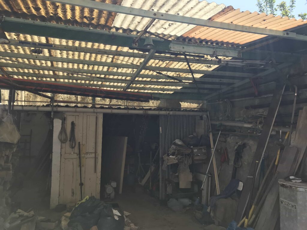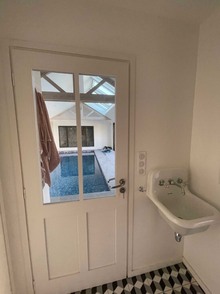 Sur l’arrière nous trouvons une cours avec ses bâtis annexes. L’ancien atelier où le maitre d’ouvrage aimait retrouver l’ancien propriétaire pour bricoler est transformé en petit logement. Celui ci jouxte la piscine intérieure qui remplace les cabanons en appentis.