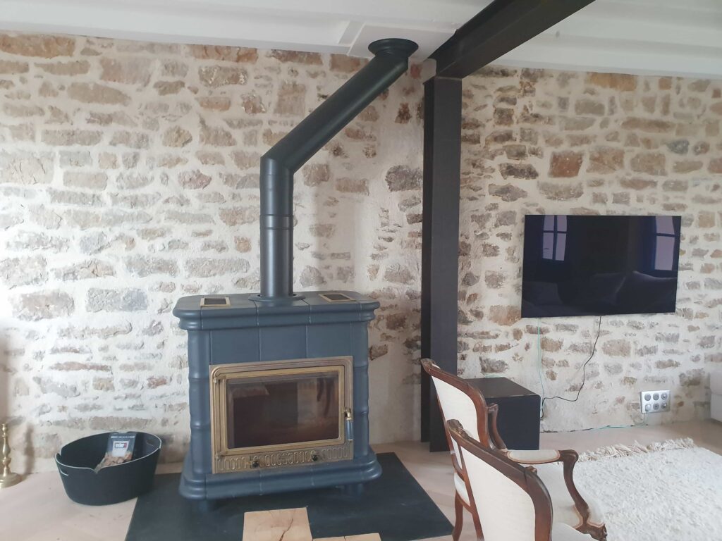 Le bâtiment principal est rénové en redonnant sont aspect initial en purgent les enduits ciments à l’intérieur au profit d’un enduit à la chaux et de sable brossé pour faire apparaitre la pierre tout en donnant de la chaleur et assainissant de facto les murs en leur permettant de respirer.