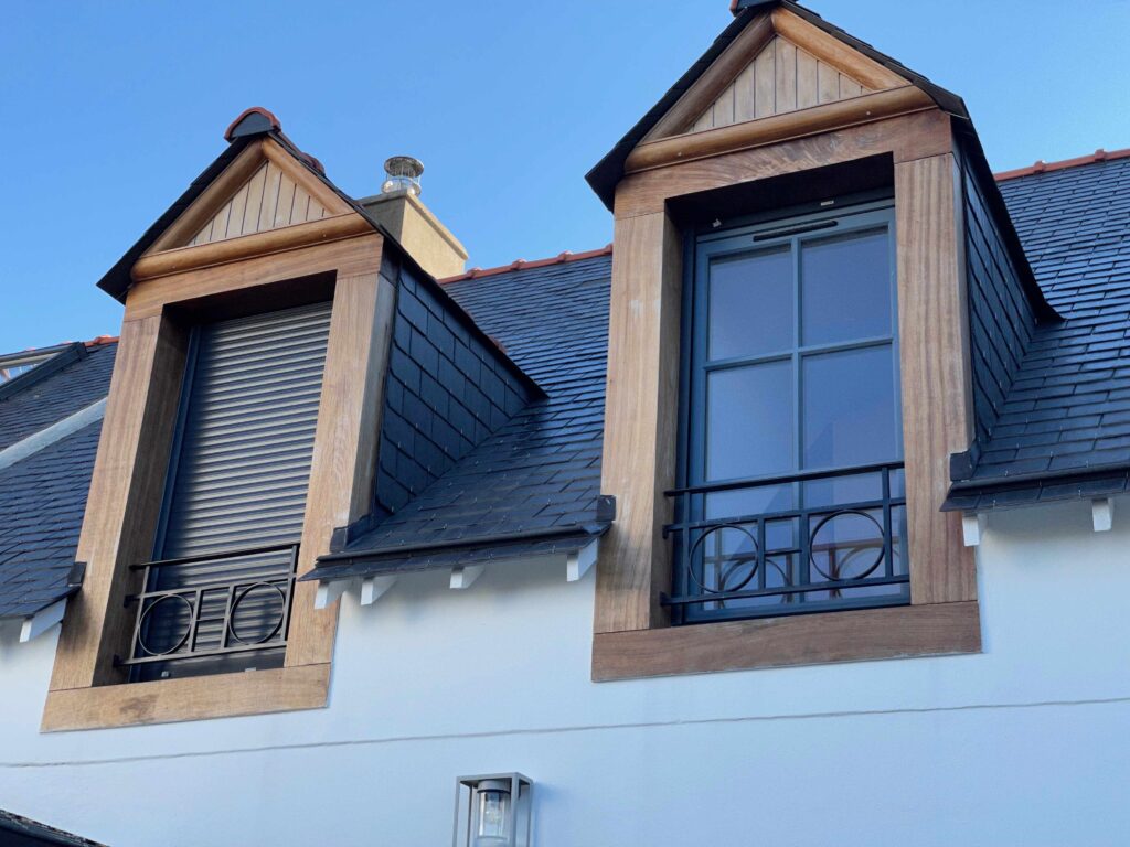 Les ouvertures sont en bois en bleu gris, la façade blanc mat, le granit, ses lucarnes en bois conforte le projet de s’inscrire dans le paysage typique de ce type de maison dans la Presqu’ile de Rhuys et d’Arzon.