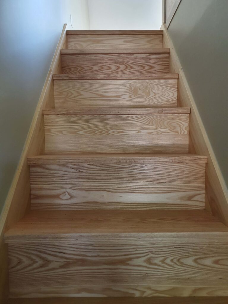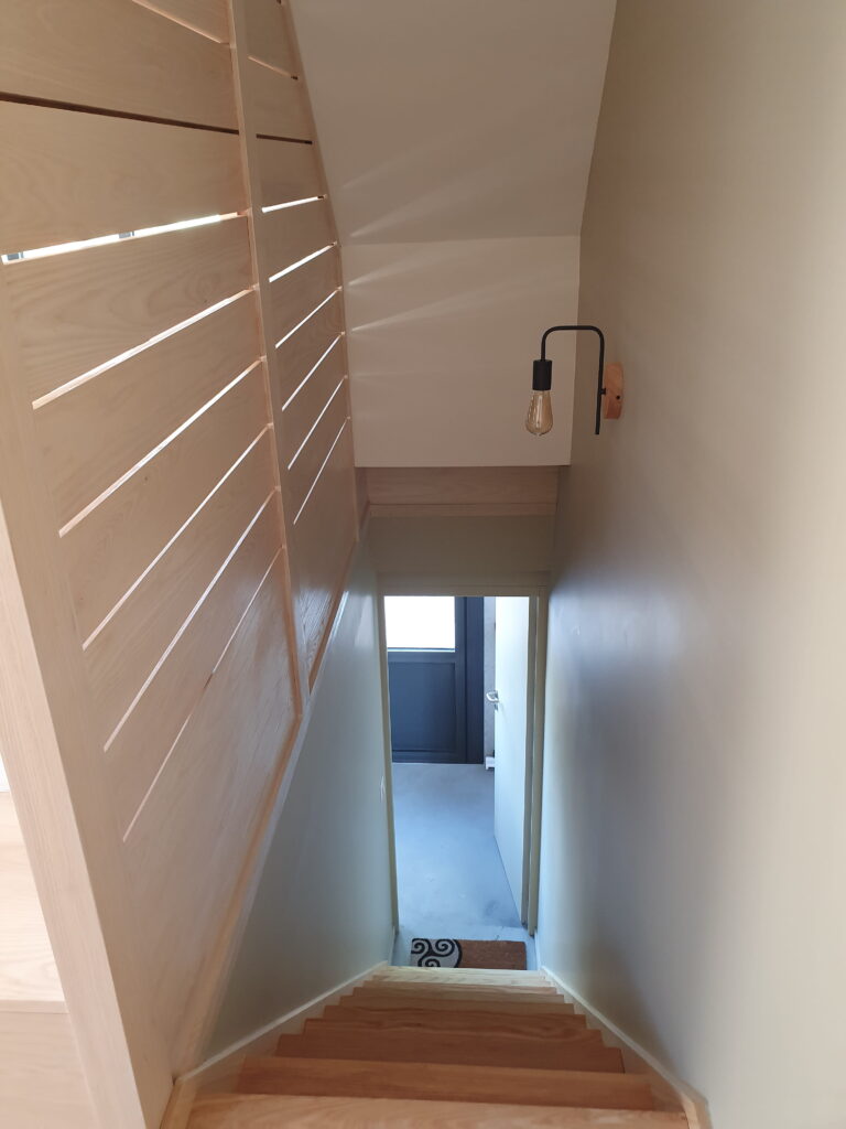 L’escalier, conçu comme un élément architectural à part entière, structure les volumes tout en conservant une grande légèreté visuelle.